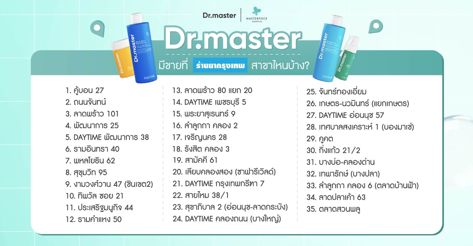 พบกับผลิตภัณฑ์ “Dr.master” ได้แล้ววันนี้ที่ “ร้านยากรุงเทพ” 35 สาขาทั่วกรุงเทพฯ พร้อมรับคำปรึกษาจากเภสัชกรผู้เชี่ยวชาญ และค้นหาสาขาใกล้คุณได้ที่ https://www.bangkokdrugstore.co.th